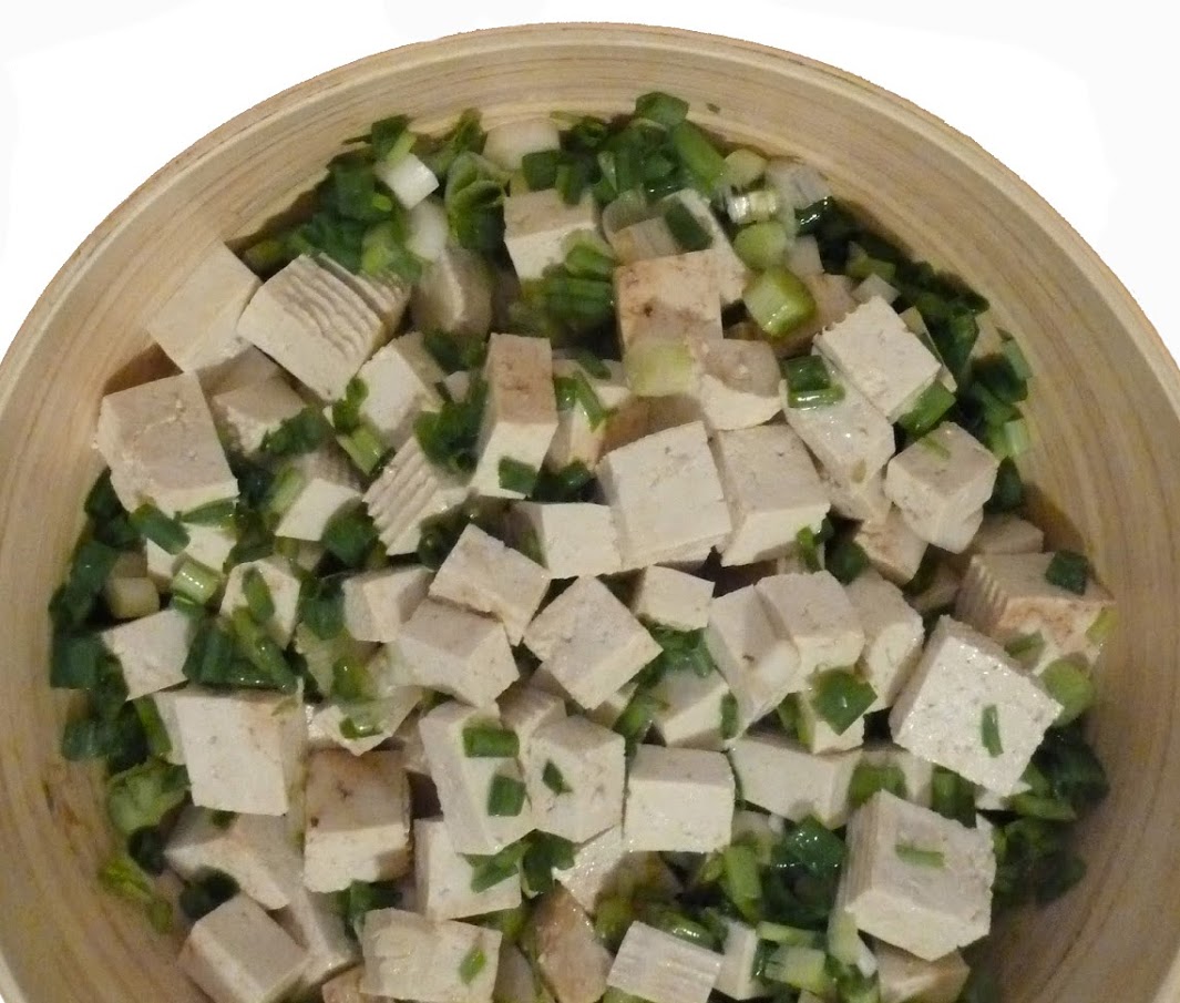 + Bước 3: Cho đậu hũ vào nồi sau đó và rắc muối biển, dầu mè và hành lá lên trên đậu hũ.